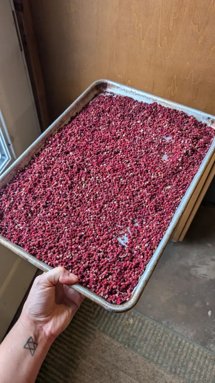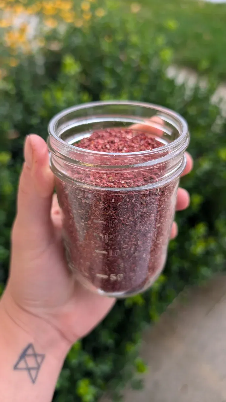 - Dehydrated mulberry leaves and staghorn sumac berries that I foraged for tea last year