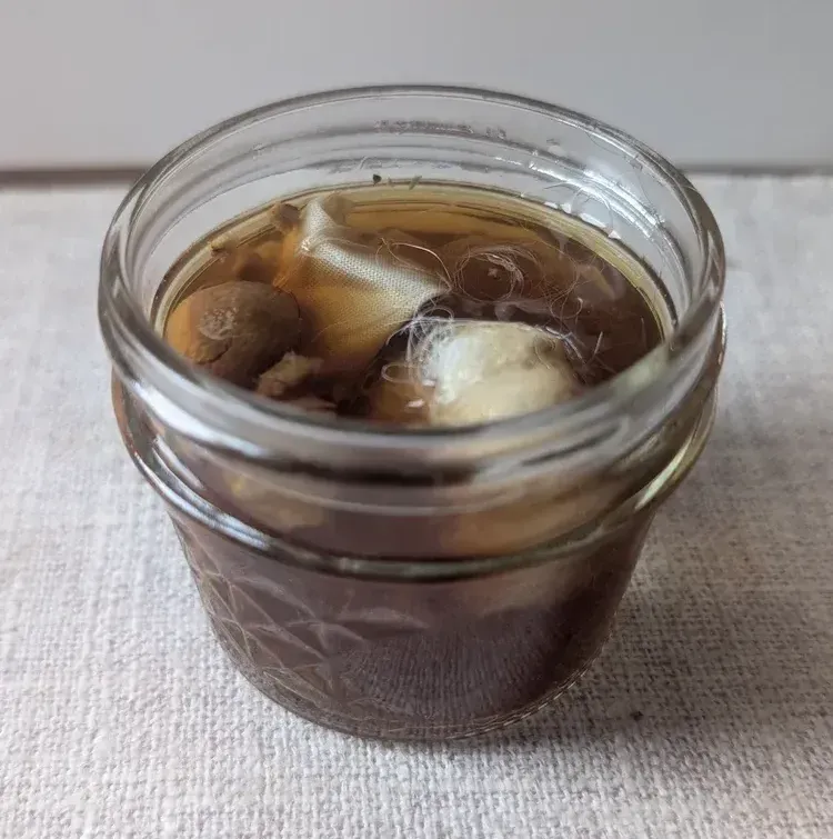 I took rough measurements of the dry materials, mostly as a point of reference for next time I use them. The galls and walnut were smashed, then the five materials were mixed with tap water in separate glass jars. I placed them in the stockpot on the stove for a few hours at low heat, then let them sit overnight. I haven’t used any of these materials before, so I’m giving them all the same treatment. Here’s how they looked in the morning: