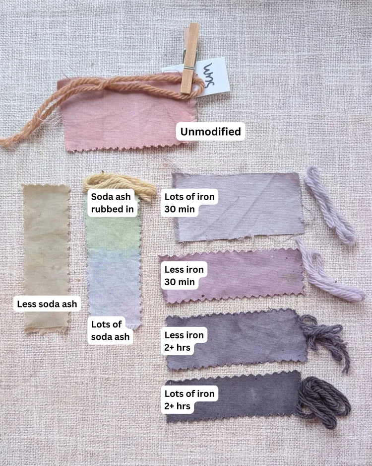 I separately used soda ash, following the same process. The amount of time each fiber scrap spent in the bath is relatively variable - I just wanted to get a rough idea of the modifier effects here. The fibers spent at least 2 hours in the dye bath, except some sumac samples.